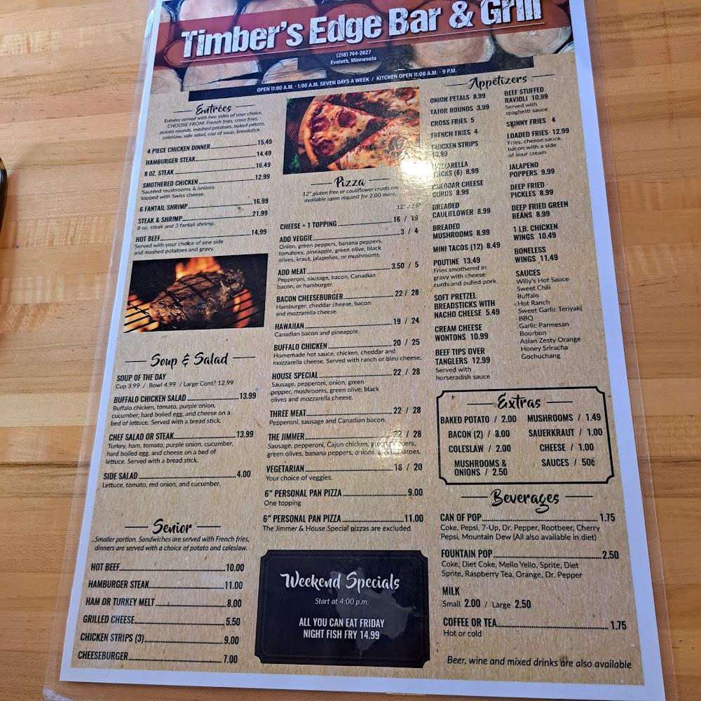 Welcome to Timbers Edge Grill & Bar, your go-to destination for delightful dining in Eveleth, MN! Nestled at 7672 Wilson Rd, our vibrant grill and pizzeria offers a relaxed atmosphere perfect for families, groups, and solo diners alike. Indulge in our locally-inspired specialties, signature cocktails, and a tantalizing array of shareable dishes. Enjoy great company while catching live sports, or savor a quick meal with our convenient takeout options. With accessible seating and ample parking, Timbers Edge is ready to serve you. Join us for happy hour specials and create unforgettable memories in a charming setting!